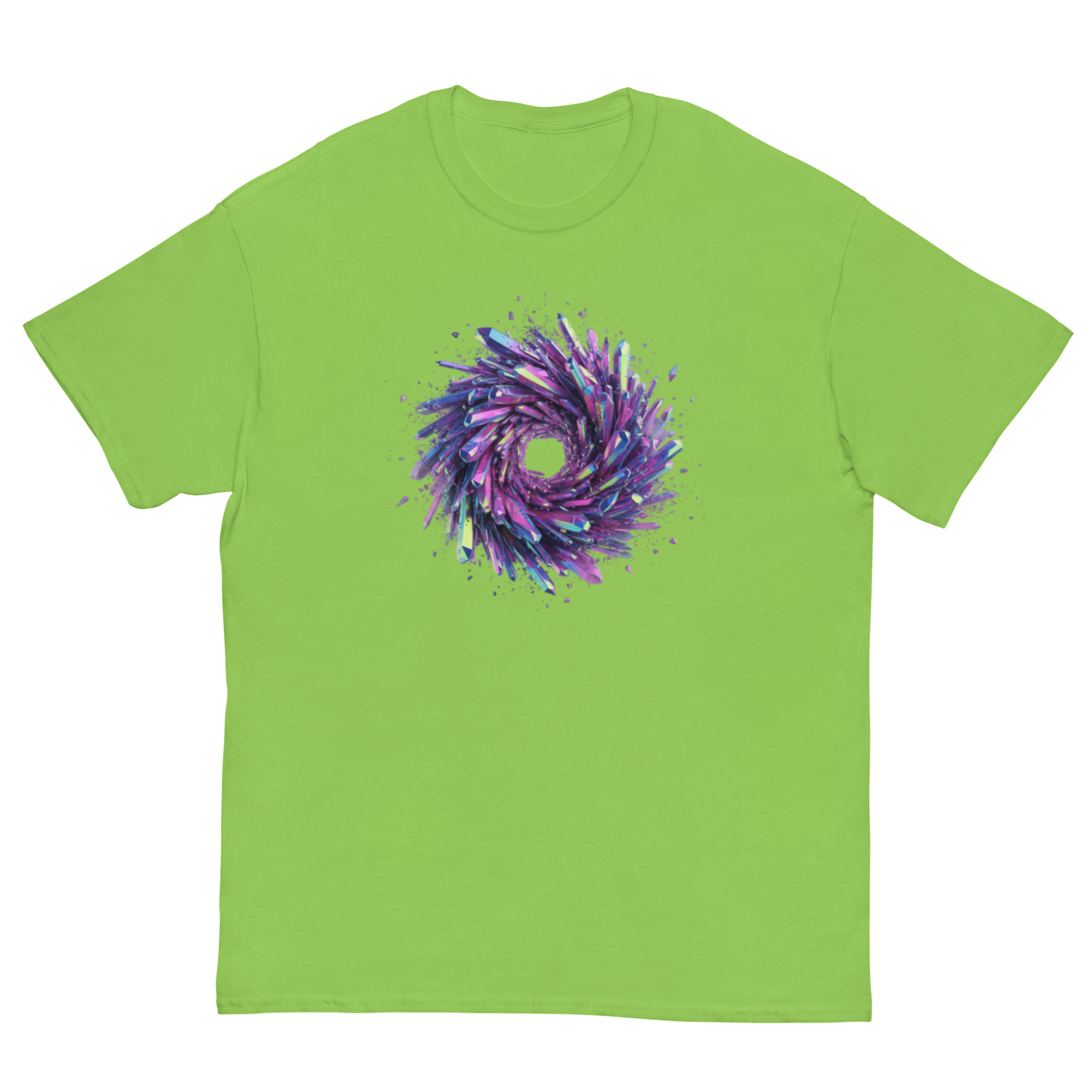 Turn heads with a high-impact Crystal Vortex graphic that looks like a burst of iridescent shards twisting into a glowing spiral portal. The “energy vortex” concept is often associated with movement, transformation, and intensity, perfect for a design that feels alive on the chest.
